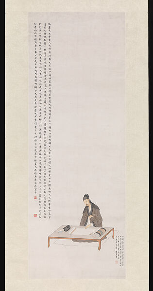 This painting depicts Qian Lou, a famous recluse who lived during Warring States period (c. 475–221 BC). Qian sits on a mat before a low table, where he prepares to write on an unfurled piece of paper. Brush in hand, inkstone and water pot at the ready, a bundle of scrolls at his side, Qian is depicted as the consummate humble scholar at his craft. Along the left side of the scroll, Yu transcribed a lengthy biography of Qian Lou from the third century text Gao shi zhuan (Accounts of high-minded men).