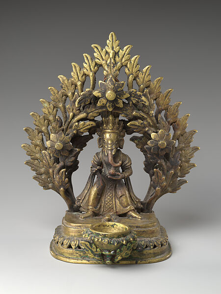 This work of art is currently on loan to the museum.This lamp shows Ganesha standing behind his rat vehicle, holding an elephant goad and a bowl of sweets. The elaborate flowering foliage radiating from the god speaks to his importance as a bringer of abundance and prosperity.