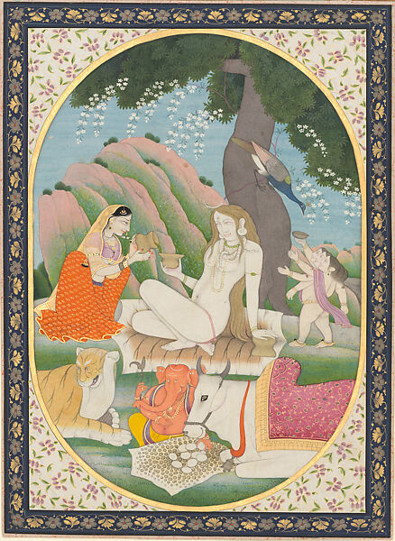 This work of art is currently on loan to the museum.Shiva is shown sitting in the mountains of the Himalayas as an ascetic who has retreated from society. Still, he is surrounded by his family, including his wife, Parvati, who pours him a drink. Behind him, his multiarmed son Skanda gestures toward a peacock in a tree, which is his vehicle (vahana). Below sit a tiger and the bull Nandi, the vehicles of Parvati and Shiva, respectively. Placed in their midst is the elephant-headed figure of Ganesha, who serves as an intermediary between the viewer and Shiva. Rather than presenting Ganesha as an icon, this painting from the foothills of the Himalayas shows the god as part of a family narrative.