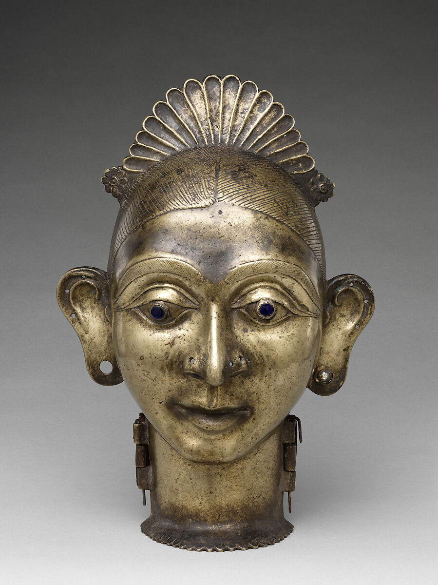 The goddess Gauri is celebrated as a manifestation of the benign aspect of Durga, herself an emanation of Parvati, and is understood by her devotees as the highest expression of female auspiciousness, with the power to fulfill all desires and grant relief from worldly sufferings. Most universal of her forms is that honored on the eighth night of Navaratri (‘nine-nights’), when the most important goddess are celebrated in the autumnal month of Asvina (September-October) in a ten-day festival. But she is widely worshipped in many guises, under local names in villages and small towns as well as in temple establishments and in the homes of devotees. These celebrations assume many regional expressions, as does the representation of the goddess who often assumes a localized form, typically drawing upon myths and legends specific to a given community. These often find expression in indigenous performative traditions. This sculpture is highly accomplished in both its conceptual sophistication and originality of execution, and is a rare example of a little studied devotional sculptural tradition, most probably originating in coastal Karnataka.