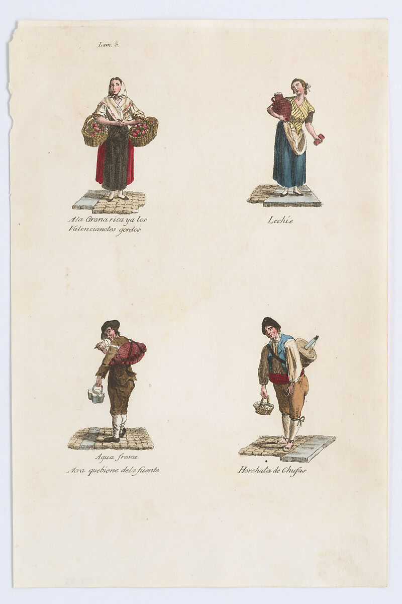- Title: Plate 3: four street vendors from Madrid selling large tomatoes, milk, water, milk shakes, from 'Los Gritos de Madrid' (The Cries of Madrid)