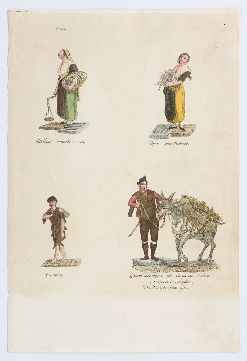 - Title: Plate 4: four street vendors from Madrid selling Albillas, radishes, carbon, from 'Los Gritos de Madrid' (The Cries of Madrid)
