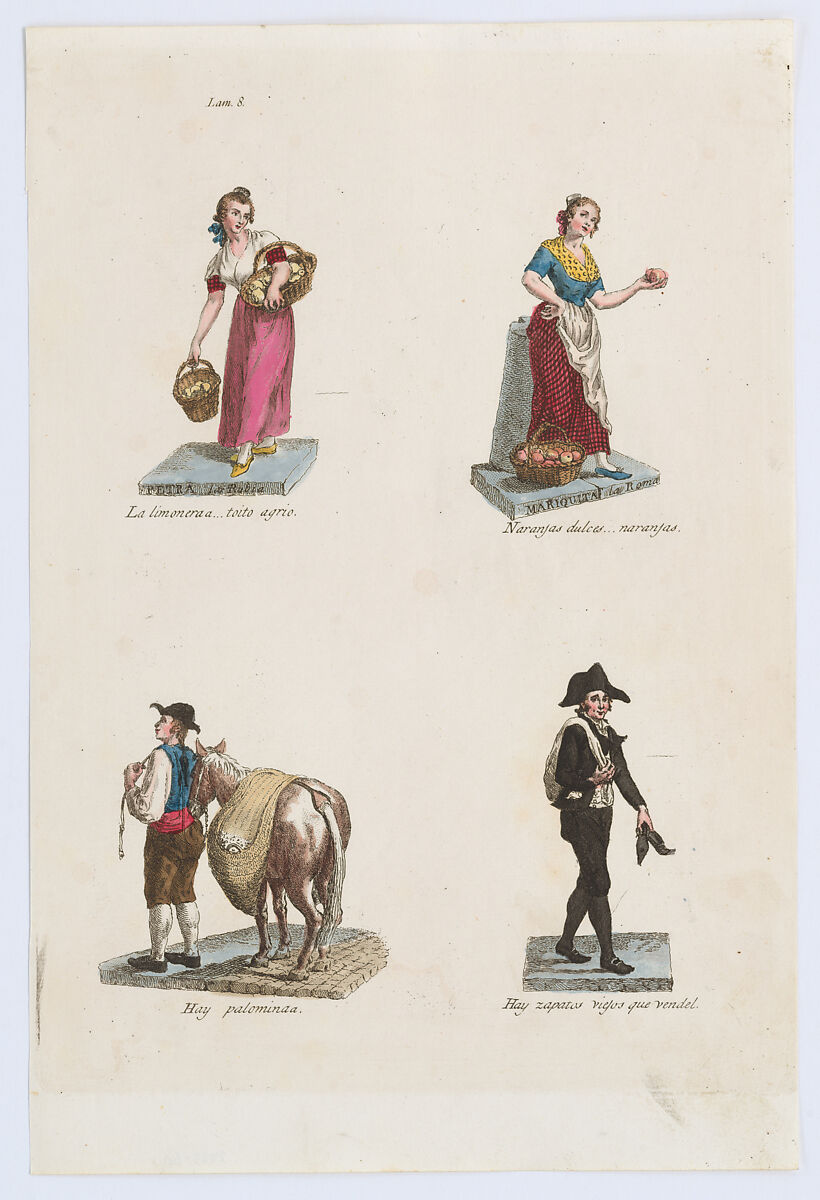 - Title: Plate 8: four street vendors from Madrid selling lemons, oranges, pigeons, and shoes, from 'Los Gritos de Madrid' (The Cries of Madrid)