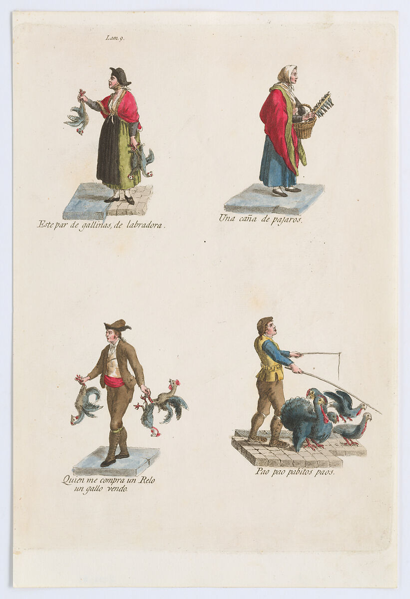 • Title: Plate 9: four street vendors from Madrid selling different kinds of birds (chicken, turkey, etc), from "Los Gritos de Madrid" (The Cries of Madrid)