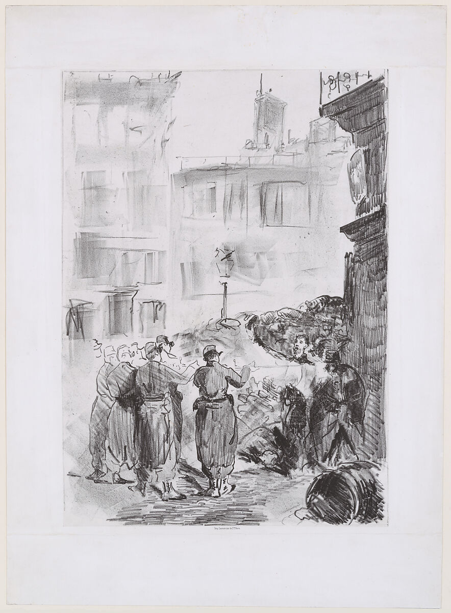 This print presents Manet’s response to the French government’s brutal suppression of the Paris Commune in 1871 filtered through the lens of art historical precedents and the artist’s own prior work. Manet borrowed the soldiers who fire upon the Communards from his censored print, "The Execution of Maximilian" (21.48), which referenced the work of Spanish painter Francisco Goya. Through this layering and the explicit depiction of violence, Manet makes clear his condemnation of the government’s actions and, consequently, the print remained unpublished until the year following the artist’s death. Beyond its political critique, the work displays Manet’s lively use of the lithographic medium. He employed the side of the crayon to indicate the brightly lit architecture of the background with broad strokes and reserved areas of the paper to suggest the rifles’ smoke.