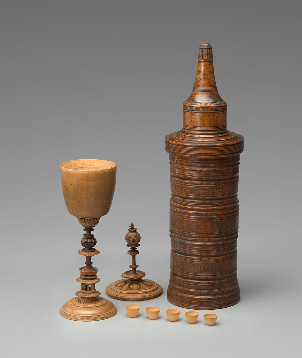 Made with a technologically advanced lathe, this turned goblet, with a large set of inserted cups and its custom case, would have been at home in a courtly Kunstkammer, or art cabinet, of the Northern Renaissance. Collectors not only valued works of art like this cup for their beauty, but also for the artistic and technological advancement required for their production. Scientific and artisanal knowledge was equated with the practical wisdom, self-mastery, and moral virtue required of a successful leader. A lathe (and an artisan) able to produce such precise ornamentation would have been rare, and this cup may have been made either by the master turners in the Alpine town of Berchtesgarden or the workshop of the Danish King Christian IV.
