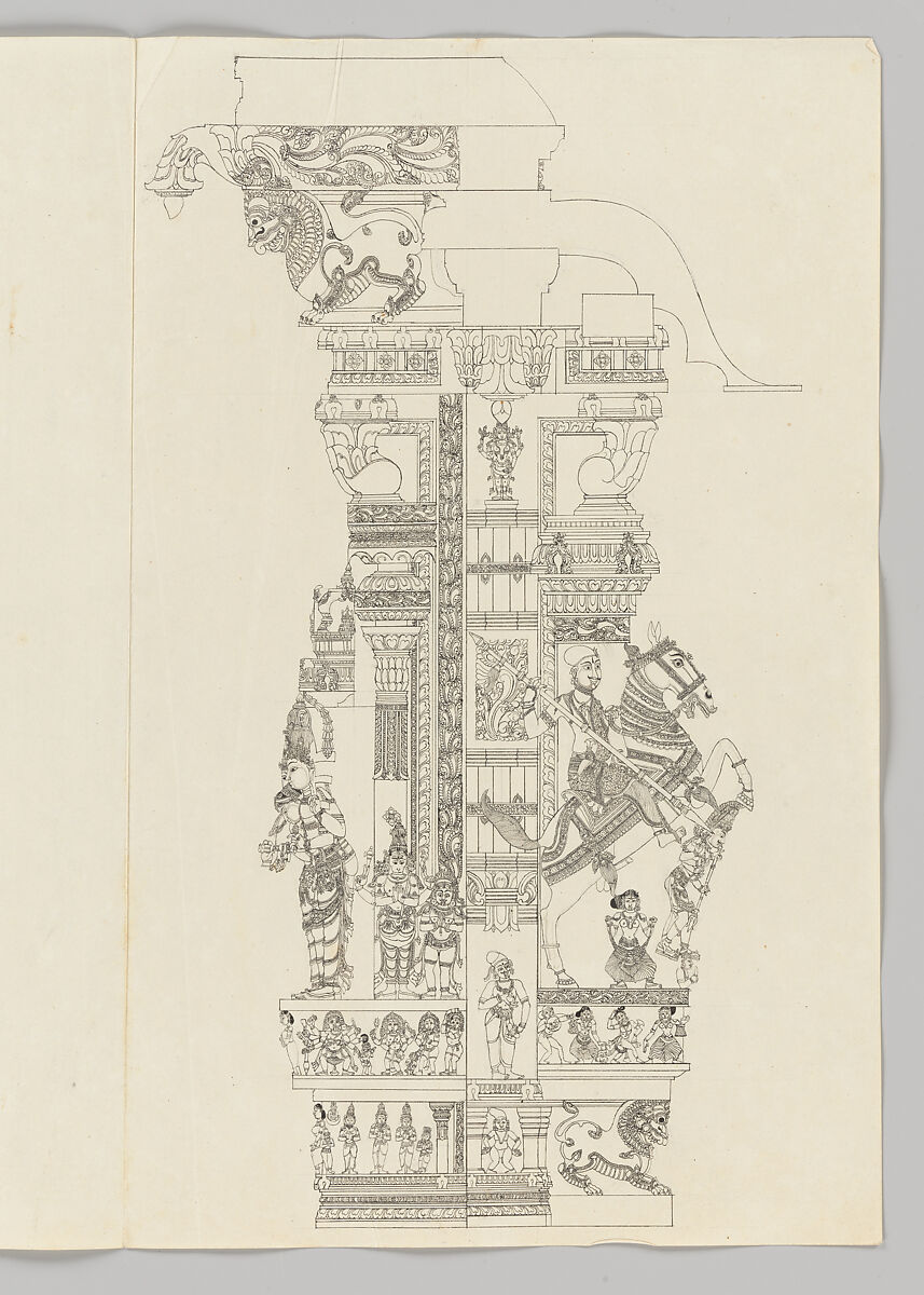 These eighteen drawings depict sculptural piers in the Pudu Mandapa (‘New Pillared Hall’), a temple festival hall built around 1630 as an addition to the Minakshi-Sundareshvara temple complex at Madurai. The hall was constructed at the behest of the Nayaka ruler Tirumala Nayak (r. 1623–59), whose reign marked a high point in temple and courtly patronage at the southern city of Madurai. The interior gallery is adorned with 124 elaborately sculpted piers, capitals and lintels decorated with narrative reliefs of the Brahmanical gods and local legends devoted to their worship. These meticulously executed ink drawings are on English laid paper watermarked ‘J. Whatman’ and with the firm’s trademark fleur-de-lis and the year 1798.