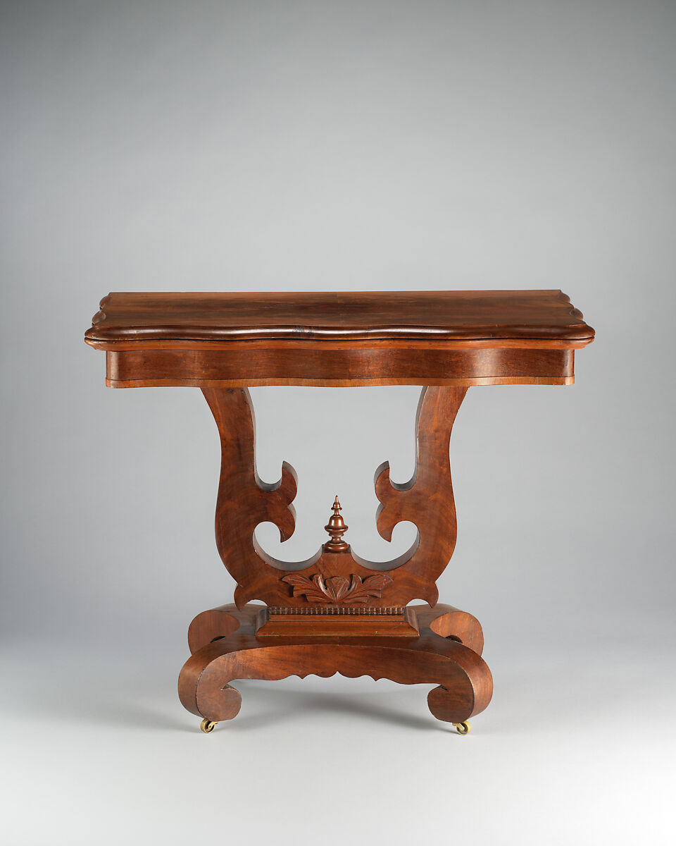 The lively form and whimsical curves of this game table are characteristic of the work of Thomas Day, a free Black cabinetmaker and architectural woodworker, who, by 1850, owned the largest cabinetmaking business in North Carolina. Furniture fashioned in Day’s workshop—which included free Black, White, and enslaved laborers—offered a distinctive, vernacular variation on the late classical forms produced in northern urban centers, such as those of Joseph Meeks in New York. Day adeptly navigated a complex political and social landscape. While creating furniture that appealed to a wealthy White clientele in the South, he also risked his life to covertly engage with abolitionist activity in the North.