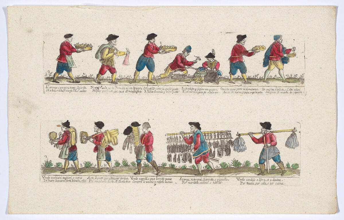 - Title: Plate 2 depicting the trades of Rome, here including vendors of fish, sieves, candles etc, from the 'Descrición de las artes que se llaman para los calles de la ciudad de Roma'