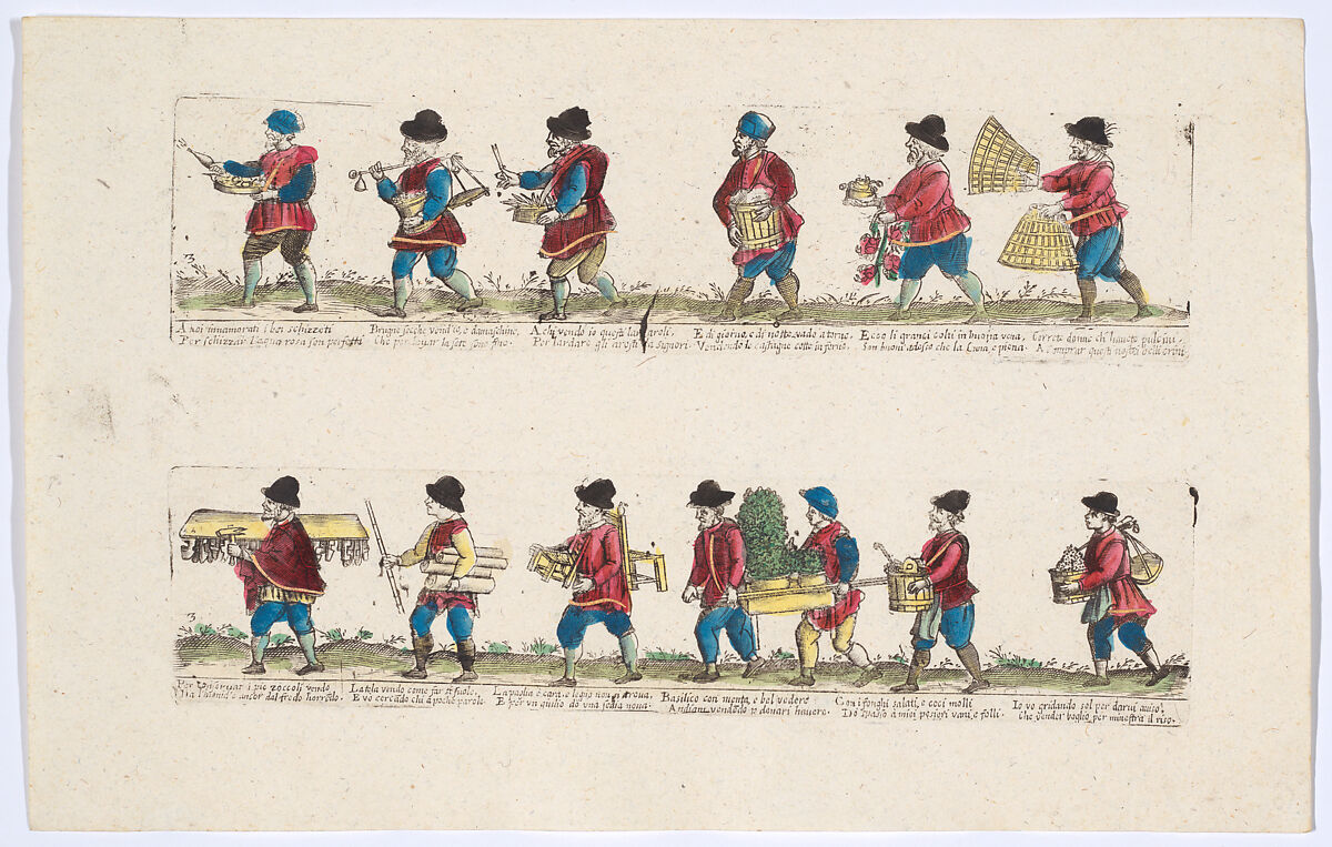 Plate 3 depicting the trades of Rome, here including vendors of flowers, chairs, basil etc, from the 'Descrición de las artes que se llaman para los calles de la ciudad de Roma'