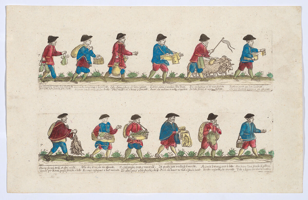 - Title: Plate 7 depicting the trades of Rome, here including vendors of books, chestnuts, portraits etc, from the 'Descrición de las artes que se llaman para los calles de la ciudad de Roma'