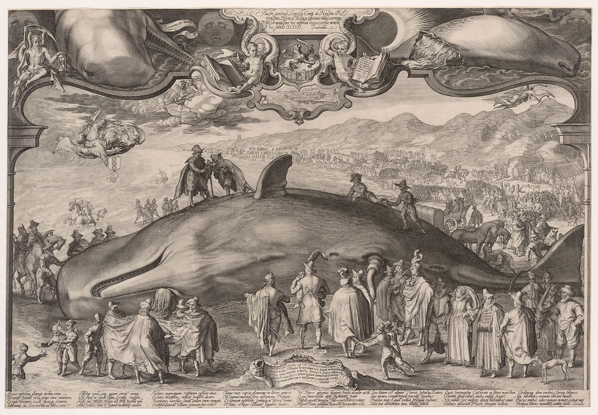 At the bottom center, Count Ernst Casimir of Nassau-Dietz lifts a large handkerchief towards his face to mask the smell of the deteriorating carcass. In the bottom left, the artist Jan Saenredam sketches the whale as his large cape engulfs the man beside him.Masses of people from all levels of society approach along the beach from the distance. The allegorical frame makes reference to the ominous events of that year that could be tied to the beaching of the whale. In the small cartouche at center inscribed "Terrae motus", an earthquake that took place off the coast of Holland is depicted (2 January, 1602). Along the top center, an eclipse of the moon and an eclipse of the sun (24 December, 1601) are depicted. On the left, the skeletal figure of Death shoots arrows at the falling Maid of Amsterdam, a reference to the plague that took place in that city in 1601-02.