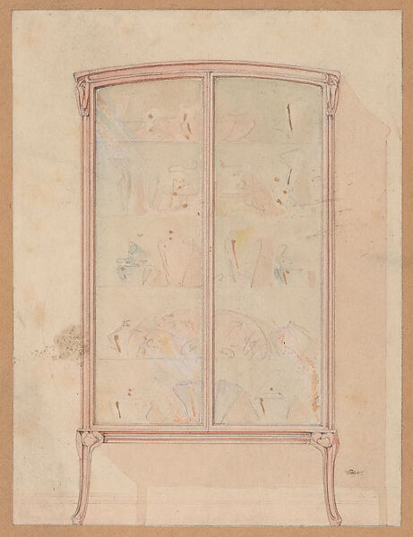 Front elevation of an Art Nouveau display cabinet, presented against a wall. The cabinet is made of wood and is sparsely decorated with carved wood ornaments. This design is part of a group of drawings representing a range of furniture designs in the French Art Nouveau style, attributed to Edward Colonna and Georges de Feure. The designs are all executed in graphite and finished with watercolor. The high degree of finish of these drawings suggest that they were used for presentation to clients, or possibly served as models for lithographic illustrations. The Museum has several furniture pieces by both artists that closely relate to the present group of drawings. The design for a small side table by Colonna, in particular, show great similarities.