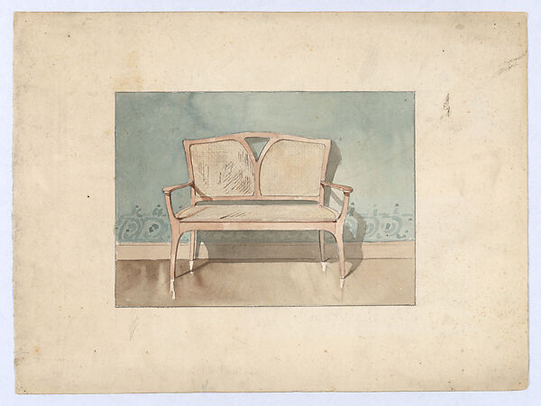 Design for a wooden bench with caning in the seating and back rest, presented against a wall. The bench has a simple silhouette and is otherwise not decorated. This design is part of a group of drawings representing a range of furniture designs in the French Art Nouveau style, attributed to Edward Colonna and Georges de Feure. The designs are all executed in graphite and finished with watercolor. The high degree of finish of these drawings suggest that they were used for presentation to clients, or possibly served as models for lithographic illustrations. The Museum has several furniture pieces by both artists that closely relate to the present group of drawings. The design for a small side table by Colonna, in particular, show great similarities.