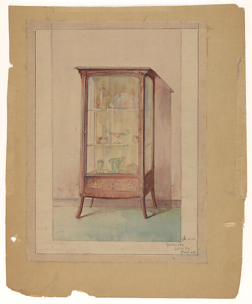 Design for a wooden display case with three shelves. The front and sides of the case are covered in glass. The bottom part of the case is decorated, possibly with wood inlay. The drawing is part of a group designs for furniture in the French Art Nouveau style by two prominent designers of the late 19th and early 20th century: Edward Colonna and Georges de Feure. The designs are executed in graphite and finished with watercolor. The furniture designs are represented in an interior setting or drawn against a blank background. All furniture pieces are meant to be made out of wood and range from small tables, cabinets and display cases, to buffets and servers, a wardrobe, a vanity table, a bench and a chair. The high degree of finish of the drawings suggest that they were used for presentation to clients, or possibly served as the model for lithographic illustrations. The Museum has several furniture pieces by both artists that closely relate to the present group of drawings, the design for a small side table by Colonna, in particular, show great similarities.