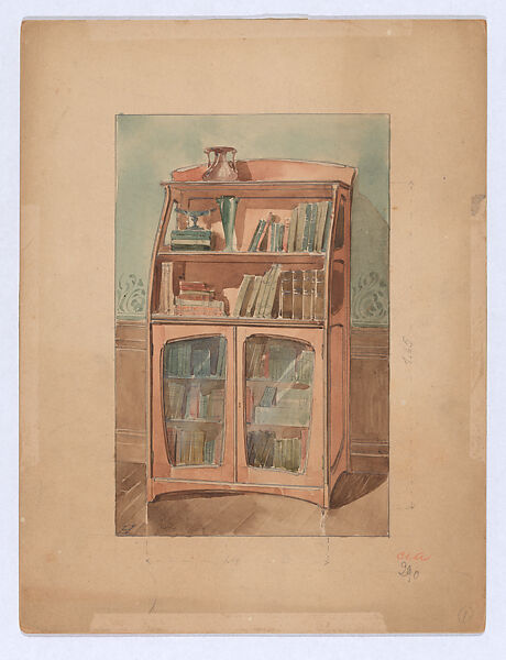 Design for a small wooden bookcase in the French Art Nouveau style. The bookcase has open shelves at top, and a section with glazed doors below that can also be locked. The bookcase is presented at angle, against a wall with blue wallpaper. This drawings is part of a group of designs attributed to two prominent designers of the late 19th and early 20th century: Edward Colonna and Georges de Feure. The designs are executed in graphite and finished with watercolor. The furniture designs are represented in an interior setting or drawn against a blank background. All furniture pieces are meant to be made out of wood and range from small tables, cabinets and display cases, to buffets and servers, a wardrobe, a vanity table, a bench and a chair. The high degree of finish of the drawings suggest that they were used for presentation to clients, or possibly served as the model for lithographic illustrations. The Museum has several furniture pieces by both artists that closely relate to the present group of drawings, the design for a small side table by Colonna, in particular, show great similarities.