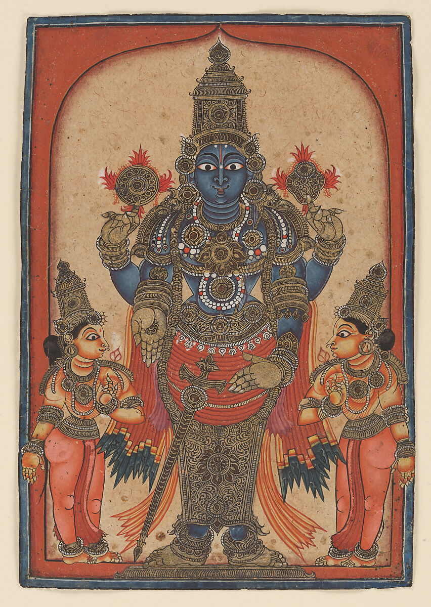 Vishnu is here depicted as Venkateshwara, “Lord of the Hill,” a form distinctive to Tirupati in southern Andhra Pradesh, where the divinity’s temple is situated high on a ridge of seven hills. The image celebrates Vishnu as he who relieves all suffering in this Age. Richly bejeweled, he wears a towering conical crown set with jewels. He is flanked by two consorts: Lakshmi, the auspicious goddess of prosperity, and Padmavathi, a local goddess whom Vishnu married. The Tirupati temple is famed as India’s greatest pilgrimage center with some 50,000 to 100,000 worshippers coming daily. It is the most visited temple in the modern world, and the richest.