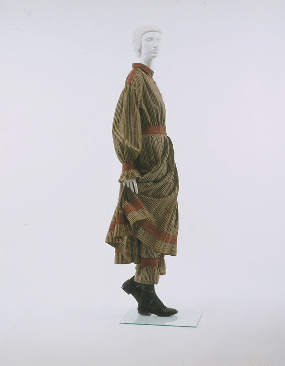 The 1860s and 1870s saw the revival of a number of historical periods in dress. Classical references were apparent in the appearance of laurel swags, wave meanders, and Greek-key bands on such categories of apparel as children's dresses, men's smoking ensembles, and dressing gowns, and on all forms of womenswear and accessories. In the bathing costume shown here, the connection to the natural and healthful life of "sport" associated with the ancient Greeks is especially apt. Of course, the wool cloth, heavy and hardly buoyant when wet, was not appropriate for vigorous water sports. Rather it was meant for what was considered the more feminine activity of "bathing," a simple immersion that allowed for some bobbing or a few strokes without any real possibility of sustained swimming.