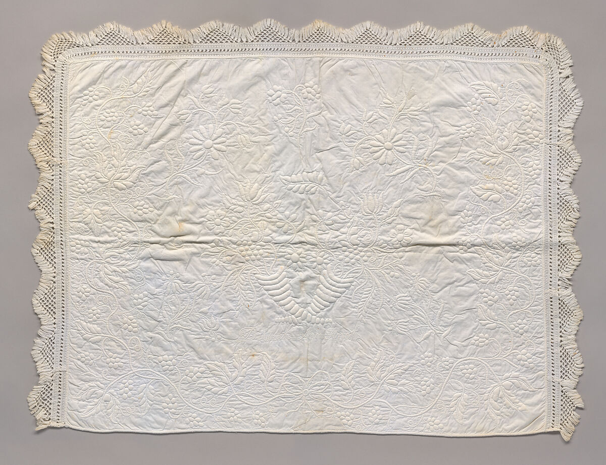 The initial impression of simplicity conveyed by this elegant, monochromatic coverlet belies the intense skill and virtuoso technique demanded of its creator, probably a talented, female amateur, creating functional decoration for her own home. Historically described as “whitework,” this is a whole-cloth quilt (as opposed to a pieced or “patchwork” quilt). It is distinguished by a total absence of colored pigment: instead, the decorative and figurative design is achieved on a bleached white support via quilted stitching, with additional relief created by highlighting and shadowing by inserting cords between layers of support. Requiring considerably more skill and dexterity to stitch than pieced quilts, works like this were conventionally regarded in Europe as more subtle and tasteful than patchwork pieces. Likely of 1830s’ production, when whitework stuffed and corded quilting was particularly popular in Britain and North America, its lusciously chunky and heavy design with abundant cornucopias and trusses of deep, well-rounded grapes is very characteristic of this period. Bearing the inscription in cording “Deborah Ann Finch”, this cot quilt was probably made to celebrate the infant’s birth.