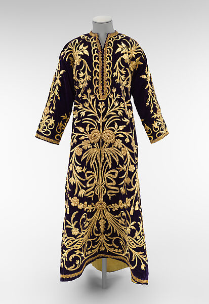 Worn by both Muslim and Jewish women in the Balkans and Anatolia for weddings and other special occasions, bindalli dresses like this came into use in the second half of the nineteenth century and were popular well into the twentieth century. They were worn by women in urban and rural contexts, remaining popular in rural areas after they had fallen out of use in urban fashion. Their name, bindalli (bindallı in Turkish), means thousand branches and refers to the embroidered decoration which was generally an elaborate design of plant motifs, often growing out of vases or arranged in garlands, executed in a couched embroidery technique called dival using gold or silver metal wrapped thread over cardboard. The dresses appear in a variety of shapes over the decades in which they were worn, demonstrating clearly the changes in dress design and tailoring modes which characterized Ottoman women’s clothing in these decades. With its round neck, front opening, dropped shoulders and straight sleeves, this example typifies one of the most common styles for the bindalli dress. The all over design of the embroidery consists of garlands, floral sprays with occasional large flowers, and a chain motif outlining the neck and front opening. Gold braid edges the hem, sleeve ends and neck opening.