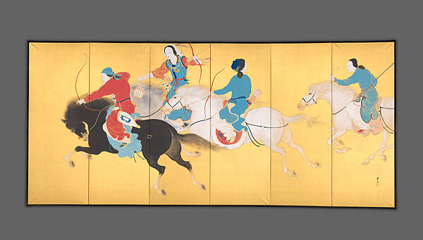 Across of the broad expanse of a pair of six-panel gold-leaf screens, five female horse riders—four on the right screen, one on the left—gallop on their steads during a hunt. Representation of the grassy plains is completely omitted, and the artist relies entirely on the forms of the figures and horses to create a believable sense of movement and spatial depth .Two of the riders are taking aim with a bow and arrow at a rabbit trying to escape between them. Mongol horses, the same species that existed in the time of the equestrian battles of Genghis Khan, are of a stocky build, with short but strong legs and large heads with long manes. Interestingly, four of the five horses are white or grey, which does not seem to be a figment of the artist’s imagination. The American writer and historian Elizabeth Kendall, travelling through southern Mongolia in 1911, observed, "I was struck by the number of white and grey ponies, and was told that horses are bred chiefly for the market in China, and this is the Chinese preference." (Wayfarer in China, 1913, chapter 13). This scene brilliantly captures the excitement of the chase, and at the same time presents an interesting and unexpected twist on the category of Taishō-era bijinga (paintings of beautiful women).