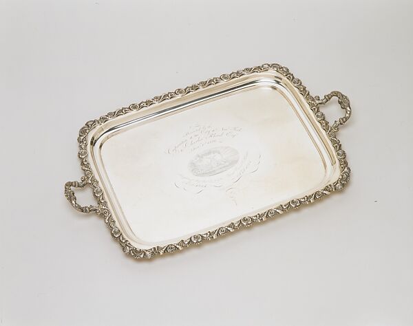 This commanding tray was presented by the Corporation of the City of New York to Charles Rhind (1779-1857) in thanks for and recognition of his work on two momentous civic occasions, the 1824 reception held for the Marquis de Lafayette and the 1825 celebration marking the opening of the Erie Canal. Rhind, a Scottish-born merchant whose successful career included engaging in trade with the Ottoman port of Smyrna and acting as agent for the North River Steam Boat Company, chaired the reception committee that welcomed Lafayette upon his arrival in New York and served as admiral of the fleet during the Grand Aquatic Display at the Grand Canal Celebration. The tray’s meticulously engraved scene of New York harbor bearing the signature of J. D. Stout underscores Rhind’s service and importance to New York City and is one of few known examples of signed engraving on American silver. Presented to Rhind in 1826 together with a similarly decorated cake basket also marked by Stephen Richard and a four-piece tea set marked by another New York silversmith, Garret Eoff (1779-1845), this tray exemplifies the complex relationships that existed among New York silversmiths during the early nineteenth century. The die-stamped border framing this tray appears on silver marked by other New York shops, and Richard may have subcontracted silversmithing to other local silversmiths including Garret Eoff, who by 1825 had discontinued retailing his work and instead devoted himself solely to manufacturing silver. That the tray was accompanied by silver marked by Eoff suggests it may have been produced by Eoff and retailed by Richard. The sharing of die-stamped borders and subcontracting parts or all of commissions are practices characteristic of the dynamic and interconnected silversmithing trade that flourished in nineteenth-century New York City.
