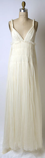 Through the twentieth century, classical dress accrued a number of associations, some more and others less historically apt. Certain of them-body consciousness, simple untailored construction, and deeply draped folds-conform more closely to their ancient prototypes than others: crisscross girdling at the midriff, fitted silhouettes, and insubstantial and unlined white materials. In these examples, classical dress is inspired not by the styles of the antique but by the fashions of the Directoire and Empire periods. Tulle and chiffon, textiles unknown to the ancient Greeks, are shirred and gathered into folds that suggest a merging of classical wet-drapery effects with the Neoclassical gowns depicted by Jacques-Louis David and Jean-August-Dominique Ingres.