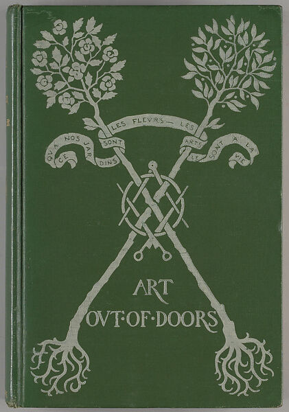 "Unsigned Margaret Armstrong binding design of a rose standard crossed with a shrub standard intertwined with a ribbon banner that reads in french: ce qua nos jardins sont les fleurs - les arts le sont a la vie -- "What flowers are to our gardens, the arts are to life", the motto of Abbe Jean-Claude-Richard de Saint Non; at the point where the two standards cross, a compass and a pair of garden shears are interwoven with a circle, the base form for most formal flower gardens. Spine has title and a repeat of the compass/shears motif in gold. An explanation of the essential principles of landscape gardening so that readers from all walks of life may admire the beauty of a well-designed formal garden. A simple and effective Armstrong design where the roots of each standard form a circular counterbalance to the flowering leafed end, and the tools used in garden planning -- shears, compass and circle -- link the design and provide a central balance for the corners of the design." -- Austin Abbey Rare Books.