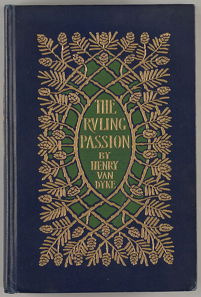 "Unsigned binding design by Margaret Armstrong in gold and green on smooth blue cloth of interwoven Eastern Hemlock (Tsuga canadensis) branches with cones forming a central lens-shaped opening containing the titles; spine with titles surrounded by multiple repeat of the Hemlock cone motif; deckled edges and top edge gilt. Includes tinted frontispiece and 7 tinted black and white illustrations by Walter Appleton Clark. A series of eight stories about passions other than love than can have power over human life. One of twelve Van Dyke covers Armstrong designed between 1901 and 1927. Here, Armstrong uses the Eastern Hemlock, a common conifer in the forests and woods of the Northeast to allude to the forests and woods where the stories take place. A fine copy with an exceptionally bright cover; a contemporary penciled ownership on the ffep. Exceptionally scarce in this condition." -- Austin Abbey Rare Books.