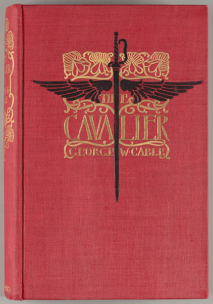 Red calico-grain cloth. Gold and black stamping on front with a winged black sword piercing the middle of the gold title. Gold stamping on spine. No decoration on back. Unsigned binding attributed to Margaret Armstrong by Gullans, Checklist (1968).