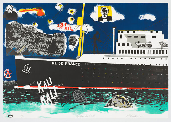 The Big Cheese is a colorful triptych consisting of three lithographs depicting a large passenger ship at sea, divided into three sections: the center (the Big Cheese; the name of the boat), the stern (Europe), and the bow (United States) in reference to its cross Atlantic voyage, the artist’s own history, and postwar geo-political European and American history. As a whole, the image, known as The Big Cheese, depicts the French ocean liner Ile de France. In 1949, the artist (then a boy) emigrated to the United States from France on the ship. The work is full of references to his history, that of his family, and that of postwar Europa and America, which either appear to be collaged or drawn on, often taking the form of graffiti markings. The work also makes reference to the celebrated French cheese, Ile de France, that share the name of the boat and is responsible for the title. Orenstein further evokes the cheese and the national flags of both France and America through visual elements. The sky for instance moves from a dark blue, almost nighttime hue above the bow, to lighter blue and white for the main ship, to deep red above the stern, thus evoking the form of the tricolor French flag, which is also imprinted on the logo for the cheese. Scattered throughout the work are images depicting such diverse figures as Max Beckmann, Jackson Pollock, Pablo Picasso, and Josef Stalin, as well as United States presidents as shown at Mount Rushmore.