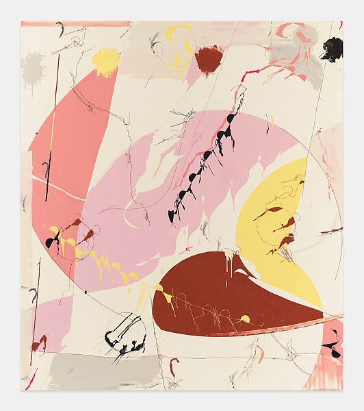 Is that all there is? references the tragic death of a child known to the artist. Its title is borrowed from a Peggy Lee song from 1969 in which the chorus enjoins the listener to accept life’s lack of transcendent meaning and drown their sorrows in the ephemeral comforts of dance and drink. Mohamedi’s distinctive approach to abstraction centers around what she has called the "meaningful mark," referring to a sphere of significance personal to the artist, which simultaneously leaves space for the viewer’s involvement. Drawing on a web of art historical and pop culture references, as well as the Southern California landscape she calls home, her paintings juxtapose flat, organic forms with sharp, script-like lines. Here, the idiosyncratic palette of bubblegum pink, buttery yellow, brick red, gray, and black reflects a sense of the deflation or extinguished promise expressed in the painting’s title.