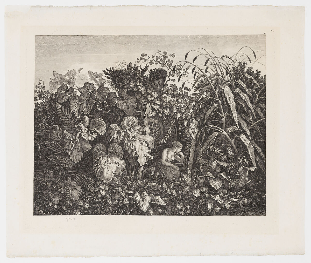 This late etching by Carl Wilhelm Kolbe was inspired by a woodblock designed by his younger compatriot Caspar David Friedrich about 1803 (see 27.11.2) widely interpreted as an expression of Romantic notions about the brevity of life. Like Friedrich, Kolbe depicts a melancholic woman sitting alone in a landscape, while a moth is about to fly into a spiderweb. Notably, however, he transforms Friedrich's spare landscape into a lush setting with varied, oversized vegetation. Over the course of his career, Kolbe produced a total of 28 such "Kraeuterstuecke" (vegetation pieces), two of his most famous featuring cows immersed in similarly dense foliage and brush (see 1994.136.1 and 1994.136.2). In the present work he amplifies the disjunction in scale of the vegetation and the figure (here a human, not a farm animal) and includes the broken remnants of a wooden structure, probably an arbor. Here, nature subsumes the products and concerns of humankind.
