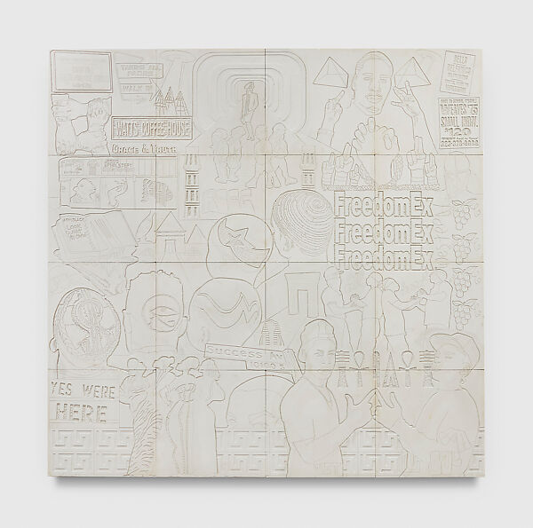 FreedomEx forms part of a larger series of direct-carved gypsum panel works that sample and remix various signs, symbols, and imagery from the artist’s local neighborhood in South Central Los Angeles. Inspired partly by the architecture and symbolism of ancient Egypt and also, the strategies and aesthetics of Afrofuturism and 1970s funk, Halsey draws upon her self-compiled visual community archive to produce these complex compositions, with their combination of sharply incised details and raised reliefs. Halsey reclaims the visual grammar of the Egyptian hieroglyph as a tool for archiving, documenting, and commemorating the people and places that constitute her community. For Halsey, this work operates on a level beyond sculpture, existing as an architectural prototype—one that could inform the wall surface of an imagined, currently unrealized, built structure—thus reflecting her broader architectural visions and future ambitions for direct community activism.