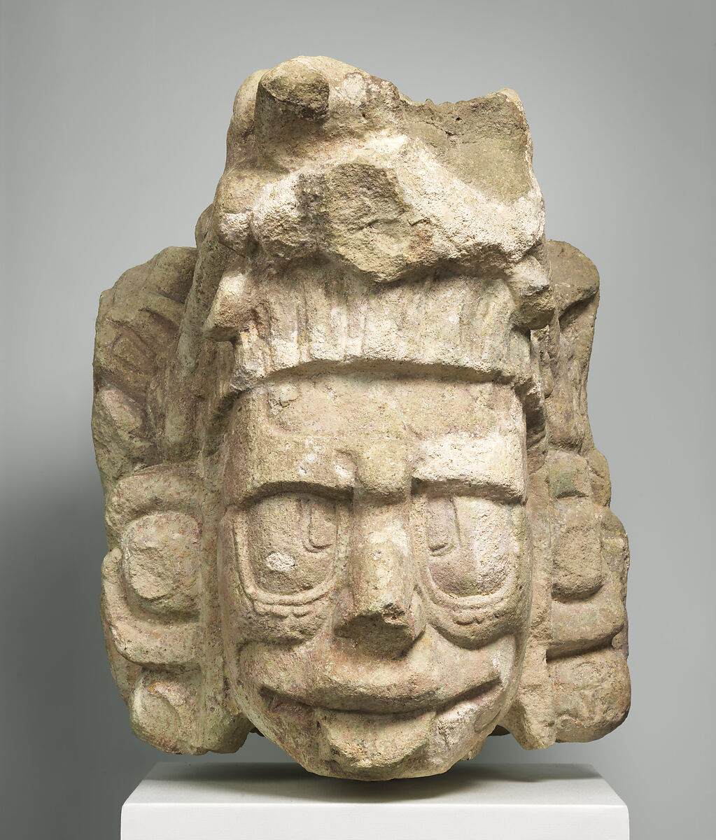 This larger-than-life sculpture depicts the striking face of K’inich, the ancient Maya solar deity. His squared, close-set pupils echo the rounded corners of his oversized eyes, which for the ancient Maya suggested a powerful eyesight capable of seeing much more than human eyes. Below the deity’s prominent nose, a single filed tooth protrudes from between his lips, reflecting ancient Maya dental modification practices that involved filing teeth into various shapes and inlaying circles of precious stone into the dental surface; this tooth, which typically takes on a T-shape, has been gently rounded. Slightly furrowed brows bunch below the hieroglyphic sign for k’in (meaning sun or day), only half of which is visible beneath the deity’s hairline and headdress. K’inich’s partially damaged headdress still contains the skeletal jaw (marked with wavy lines and dots) and curved teeth of a centipede, which was visually associated with the sun’s shining rays. Although damage to the headdress complicates our view of other details of this piece, a few remain visible at the edges: the eyes and snout of the centipede on either side and the top of the headdress, round earflares, and possible panaches of feathers would have completed this elaborate headpiece.