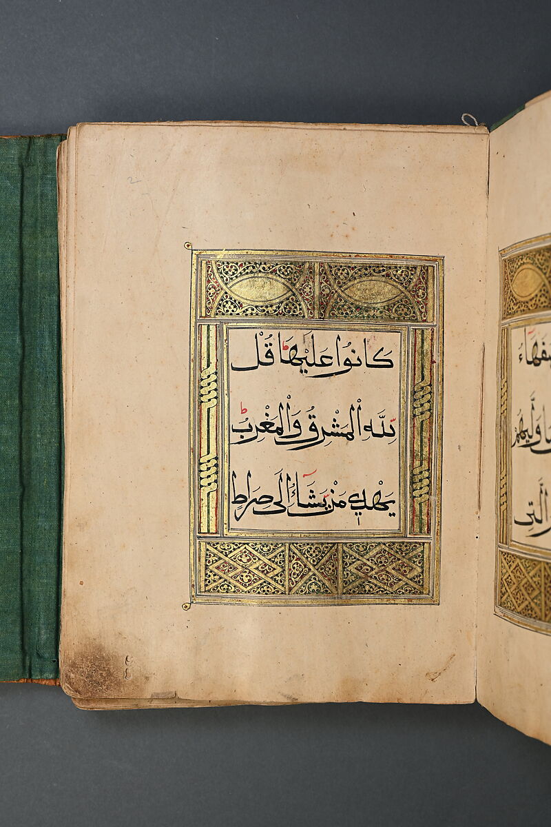 This juz' is written in Sini script, a variation of muhaqqaq (one of the six canonical proportional scripts). Several of its folios are illuminated with decorative patterns characteristic of Sini Qur'ans. These are typically executed in gold and outlined in black, green, and red ink. The patterns and motifs found in these Qur'ans include overlapping circles, eye-shaped and lobed cartouches, four-petalled floral diesigns and star-shaped geometric forms, and plaited framing devices. This juz' features ornate swirling vegetal designs in the outside borders and is bound in richly decorated stamped brown leather binding featuring Sini calligrams in teardrop-shaped medallions, sinified cartouches, and medallions.