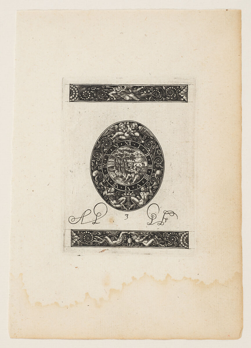 Antoine Jacquard was active as a metalsmith in Potiers in the first half of the seventeenth century. He appears to have published his designs in print with some regularity throughout his career. They now form the only record of the kinds of objects he would have produced in his workshop. Their subjects range from designs for lock plates, sword hilts, and pommels, to finely-wrought watch cases such as these. This series consists of six sheets, each showing an oval watch case at center, either representing the clock face, or the verso of the case. At the top and bottom of the print decorative friezes are depicted which represent options for the decoration of the sides of the watch case. The prints have been partially executed in the blackwork technique, which may indicated that the watch cases were meant to be enameled, as was the fashion in the early seventeenth century. The prints are not bound, but the original holes where the series would have been tied together with a piece of rope are preserved in the generous margins of the prints.