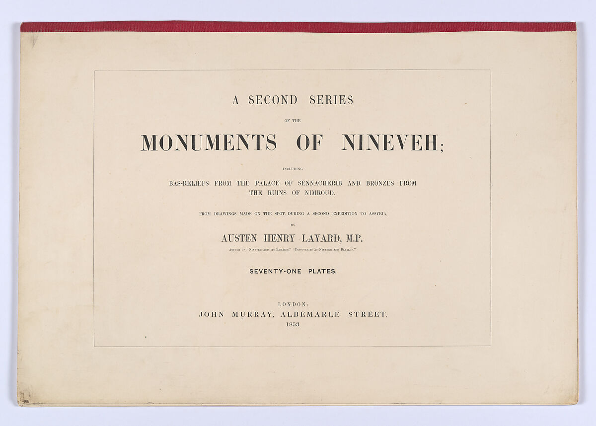 This volume and its predecessor, The Monuments of Nineveh (1849) (2023.719), were far more lavish publications than Nineveh and its Remains, produced for a small number of subscribers. The large-format volumes consisted mainly of fine lithographs, some hand-colored, based on Layard and other artists’ drawings of the palace sculptures. Where the first volume was focused more on Layard’s earlier discoveries at Nimrud (ancient Kalhu), the second contains more sculptures from Nineveh, where Layard and other excavators found many palace reliefs depicting the military campaigns of Sennacherib and Ashurbanipal.