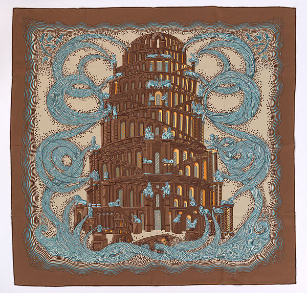 The architecture in Annie Faivre’s playful design is based on fantastic depictions of the Tower of Babel in European art and is particularly close to an engraving in Athanasius Kircher’s 1679 Turris Babel (2023.718). The Neoclassical Tower is populated by creatures drawn from ancient Near Eastern, Greek and Roman, and Indian art. Faivre’s designs for Hermès have included other ancient and mythological themes, including Zenobia, queen of Palmyra, and ancient nomadic art of the Eurasian Steppe.