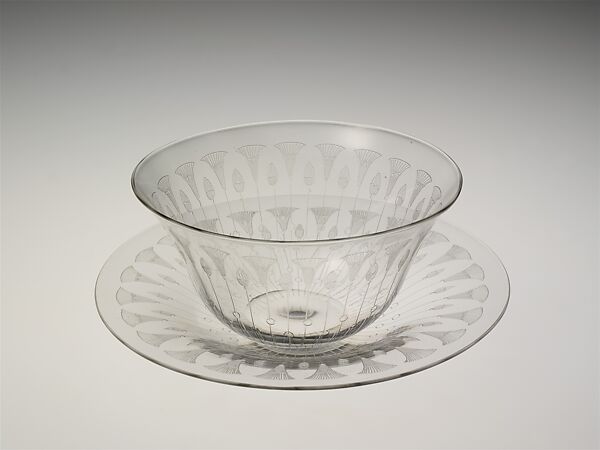 The glass factories founded by Alsatian émigré Christian Dorflinger were arguably among the most significant glass factories in operation from the mid to late nineteenth century. His first factory was in Brooklyn, New York, from which he relocated his operations to White Mills, Pennsylvania, where this object was made. His products were renowned both for the fine quality of the glass and for their accomplished cutting. In contrast to the deeply cut and finely engraved decoration embellishing other works by the firm, the simple, flat pattern on this bowl and plate was achieved by acid etching. The decoration is in the "Kalana Lily" pattern, a design of stylized Egyptian papyrus in repeat.