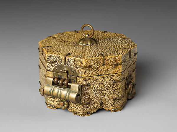 This small box is an excellent example of ray skin decoration. Ray skin is often found on late Joseon lacquerware and furniture. Joseon artisans cleverly used ray skin, with its range of colors--off-white, yellow, orange, red, and blue--to depict various motifs. This box, likely used to hold seals, illustrates the material beauty of ray skin. The scalloped feet and detailed brass fittings offer further evidence of the box’s meticulous design and expert craftsmanship.