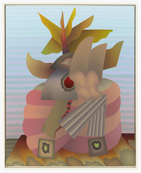 While socially and aesthetically linked to Chicago’s Monster Roster as well as Imagist artist groups, Evelyn Statsinger made work that was profoundly individual. She mined the history of art, anthropological specimens, and the natural environment in the production of her unique compositions. In drawings and paintings, she blurred the boundaries between abstraction and representation to produce visionary, often fantastical images as a response to the world around her. In Harvest Angel, a vaguely organic form composed of green, leaflike elements rests atop a complex construction of gray and pink shapes. At the center and bottom, open forms suggest mouths or even eyes. Behind, indistinct stripes animate this surrealistic "portrait." Statsinger’s control of her pigment allows the painting to toggle between precision and suggestion, flatness and depth, presence and imagination.