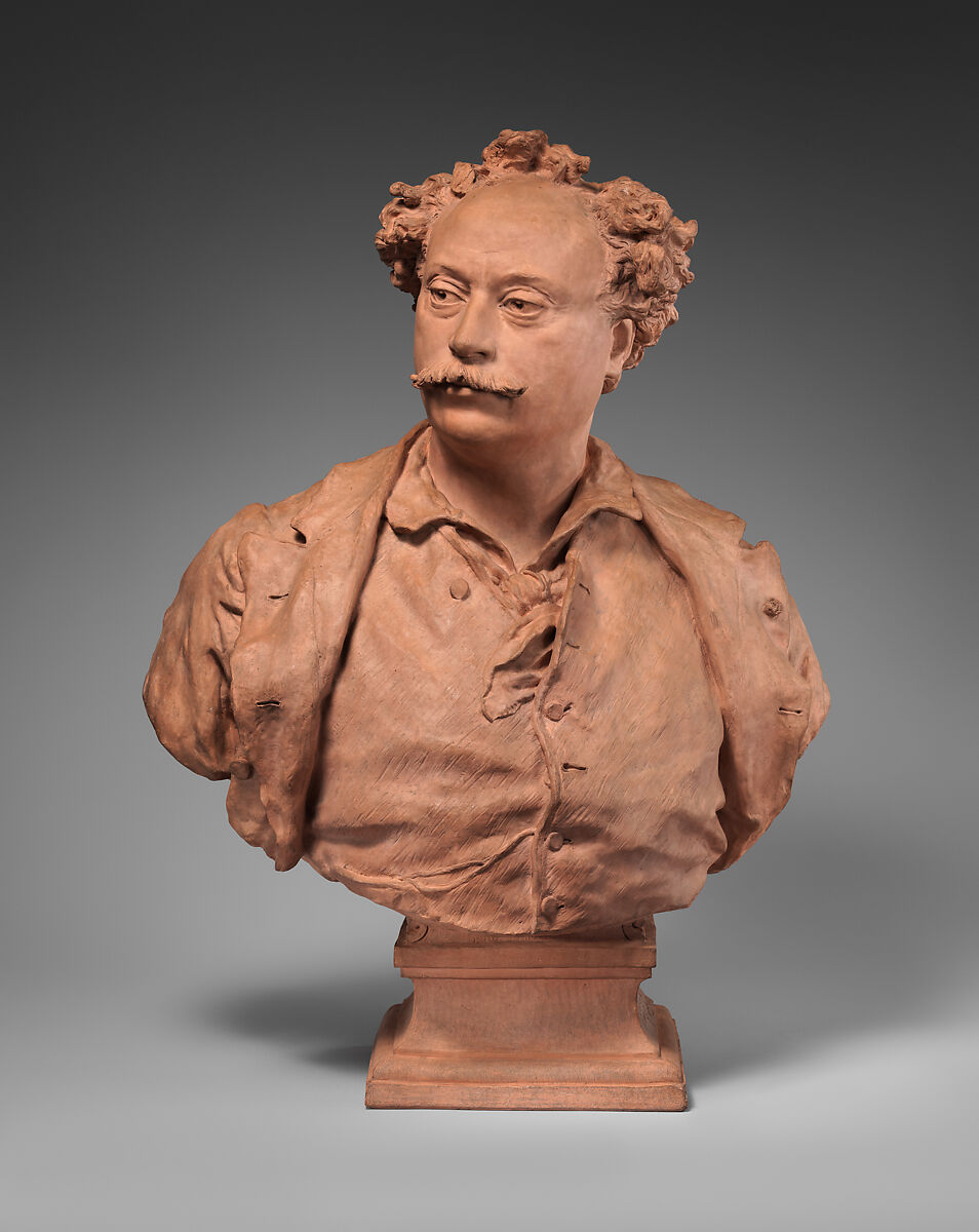 The bust exemplifies Carpeaux’s original approach to the genre of portraiture, as he captures the lively countenance of his famous sitter with bold confidence and élan. It further stands out as an exceptionally rare example of a nineteenth-century portrait of a known, celebrated person of African descent. Dumas fils is the grandson of Thomas-Alexandre Dumas (1762-1806), the first Black general in the French army. Born in Saint-Domingue to a French noble father (Alexandre-Antoine Davy) and enslaved Black mother (Marie Cessette Dumas), Thomas followed his father back to France. His son, Alexandre Dumas père (1802-1870), was the acclaimed author of The Three Musketeers and Count of Monte Christo. Dumas fils followed in his father’s literary footsteps, gaining prominence for his novel La Dame aux Camélias (1848), which he adapted into a play that inspired the libretto for Verdi’s opera, La Traviata (1853) and, furthermore, has been widely cited as a source for Manet’s Olympia (1863).