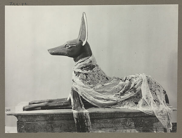 Harry Burton documented several layers of linen on a figure of the jackal-headed god Anubis before they were removed by the excavators of Tutankhamun's tomb. The body was found covered in a large, carefully arranged textile, a repurposed fringed tunic bearing the name of King Akhenaten, who was probably Tutankhamun's father. Beneath that was a thin shroud (as shown here), followed by floral garlands around the figure's neck. A long piece of cloth had also been draped around the neck like a scarf, trailing downward (also shown here). This bottommost layer would have been the first step in the sequence of shrouding and garlanding the diety figure. (For other layers see TAA 92 and TAA 96.)