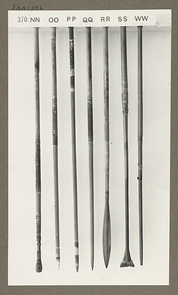 Along with elaborately decorated and gilded weapons for ceremonial purposes, Tutankhamun was buried with many unpretentious items, such as slingshots (see TAA 692) or arrows. Harry Burton made two photos of the arrows here with slightly overlapping framing, allowing full documentation and showing the details of the different tips (as shown here) and the feather fletching (see TAA 107).