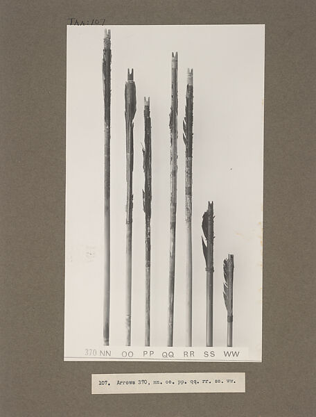 Along with elaborately decorated and gilded weapons for ceremonial purposes, Tutankhamun was buried with many unpretentious items, such as slingshots (see TAA 692) or arrows. Harry Burton made two photos of the arrows here with slightly overlapping framing, allowing full documentation and showing the details of the different tips (see TAA 106) and the feather fletching (as shown here).