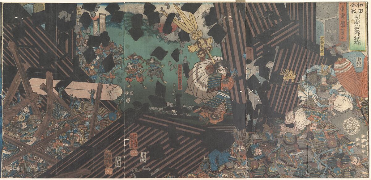 The Wada Rebellion was fought in spring 1213 in Kamakura, the headquarters of the Kamakura shogunate since 1185. The unrest was instigated by the warrior Wada Yoshimori against Hōjō Yoshitoki, regent of the shogun. In this triptych, Wada Yoshimori’s son Asahina Yoshihide crashes through the gate of the Hōjō stronghold at center. Hōjō Yoshitoki appears at far right, while his men are crushed by the collapsing structure.