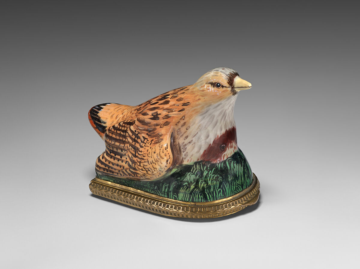 Enameled objects like this one, intended to imitate the lustrous quality of porcelain, were among the more affordable goods sold at toyshops across London and in fashionable English resort towns. Though often called "Battersea enamels" in common parlance (referring to the manufactory at York House, Battersea, operating only between 1753 and 1756), we rarely know exactly where individual pieces were made. The main centers of enamel production were in London, South Staffordshire (particularly in Bilston and Wednesbury), and Birmingham.
