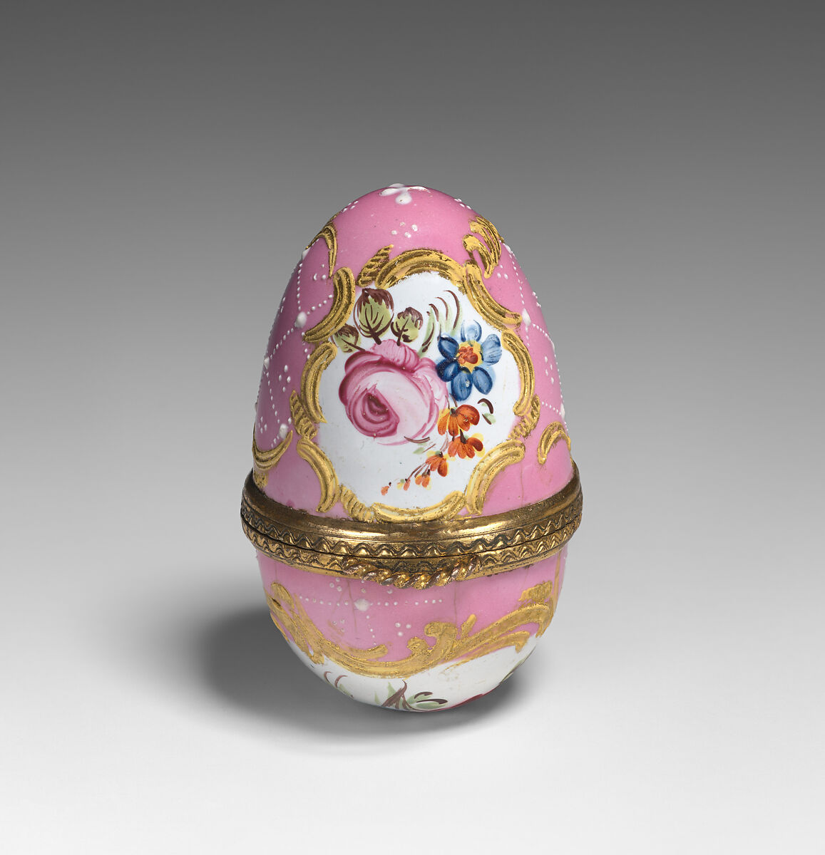 Enameled objects like this one, intended to imitate the lustrous quality of porcelain, were among the more affordable goods sold at toyshops across London and in fashionable English resort towns. Though often called "Battersea enamels" in common parlance (referring to the manufactory at York House, Battersea, operating only between 1753 and 1756), we rarely know exactly where individual pieces were made. The main centers of enamel production were in London, South Staffordshire (particularly in Bilston and Wednesbury), and Birmingham.