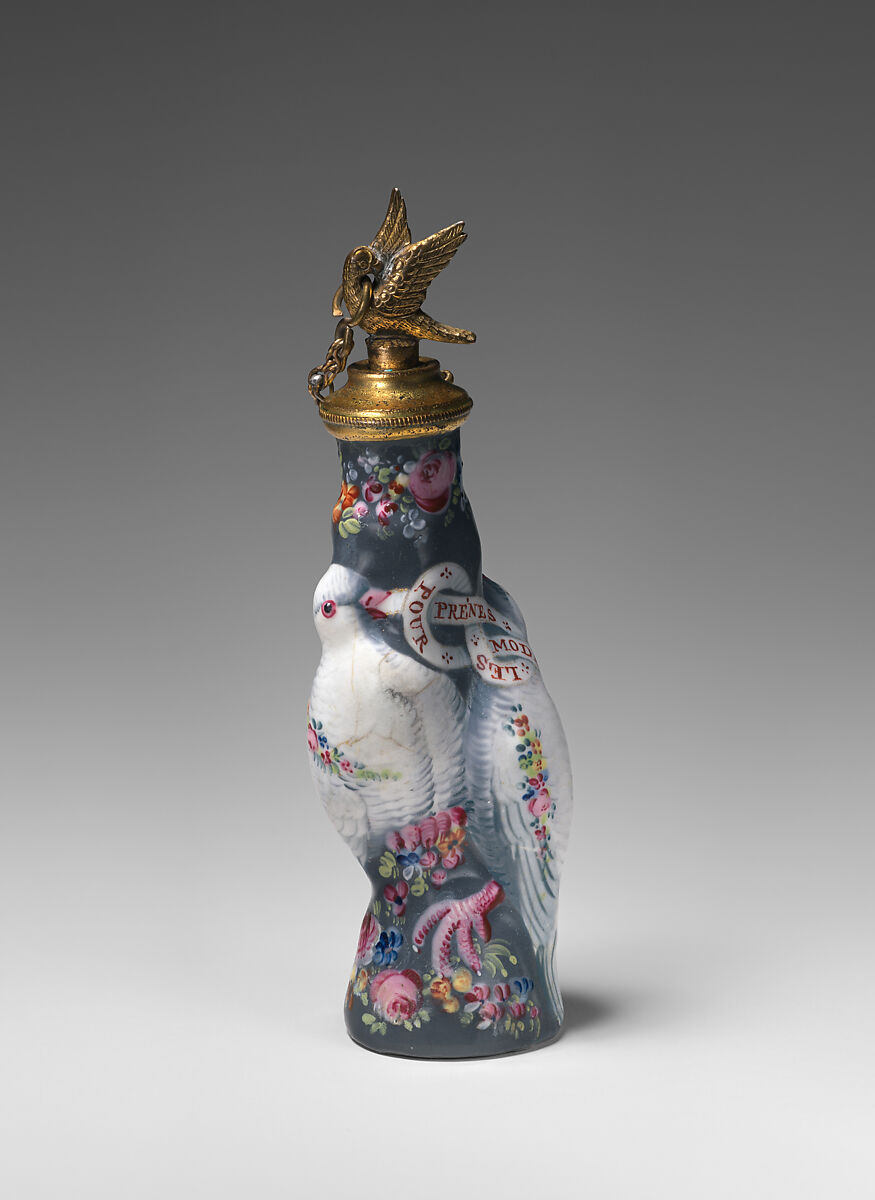 Decorated with two doves, a symbol long associated with love, this bottle would likely have been given as a romantic gift. The two birds hold a ribbon in their beaks that is inscribed with the grammatically incorrect French phrase "prenes les pour modele" intended to mean "take them [the doves] as a model." The Met has another bottle in its collection with the same design (64.101.809a, b).